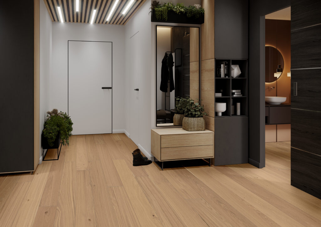 Les dimensions maximales du plancher d’un étage (maison/appartement) pour lesquelles un sol hybride posé en flottant ne nécessite pas de joint de dilatation dans les passages de portes sont de 12 m x 12 m.