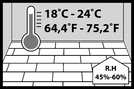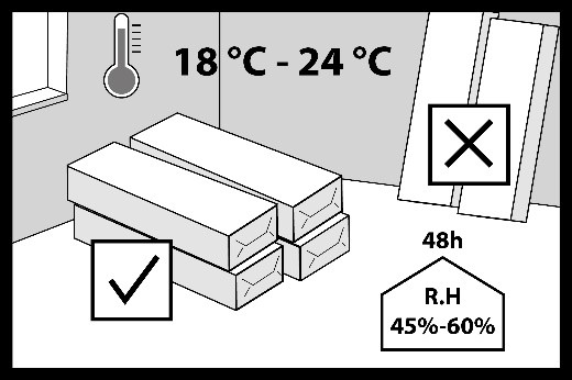 Les emballages contenant les lames hybrides doivent être manipulés avec précaution lors du transport et du déchargement afin d’éviter tout dommage mécanique. Les lames hybrides, dans leur emballage d’origine, doivent être stockées dans un endroit sec, en position horizontale, sur des palettes ou des poutres en bois. Un espace libre d’au moins 75 mm doit être prévu entre les emballages des lames hybrides et le sol. Les lames hybrides doivent être conservées dans leur emballage d’origine dans la pièce où elles seront posées pendant au moins 48 heures afin d’assurer leur acclimatation. La température ambiante doit être comprise entre +18°C et +24°C. L’humidité relative de l’air doit être comprise entre 45 % et 60 %.