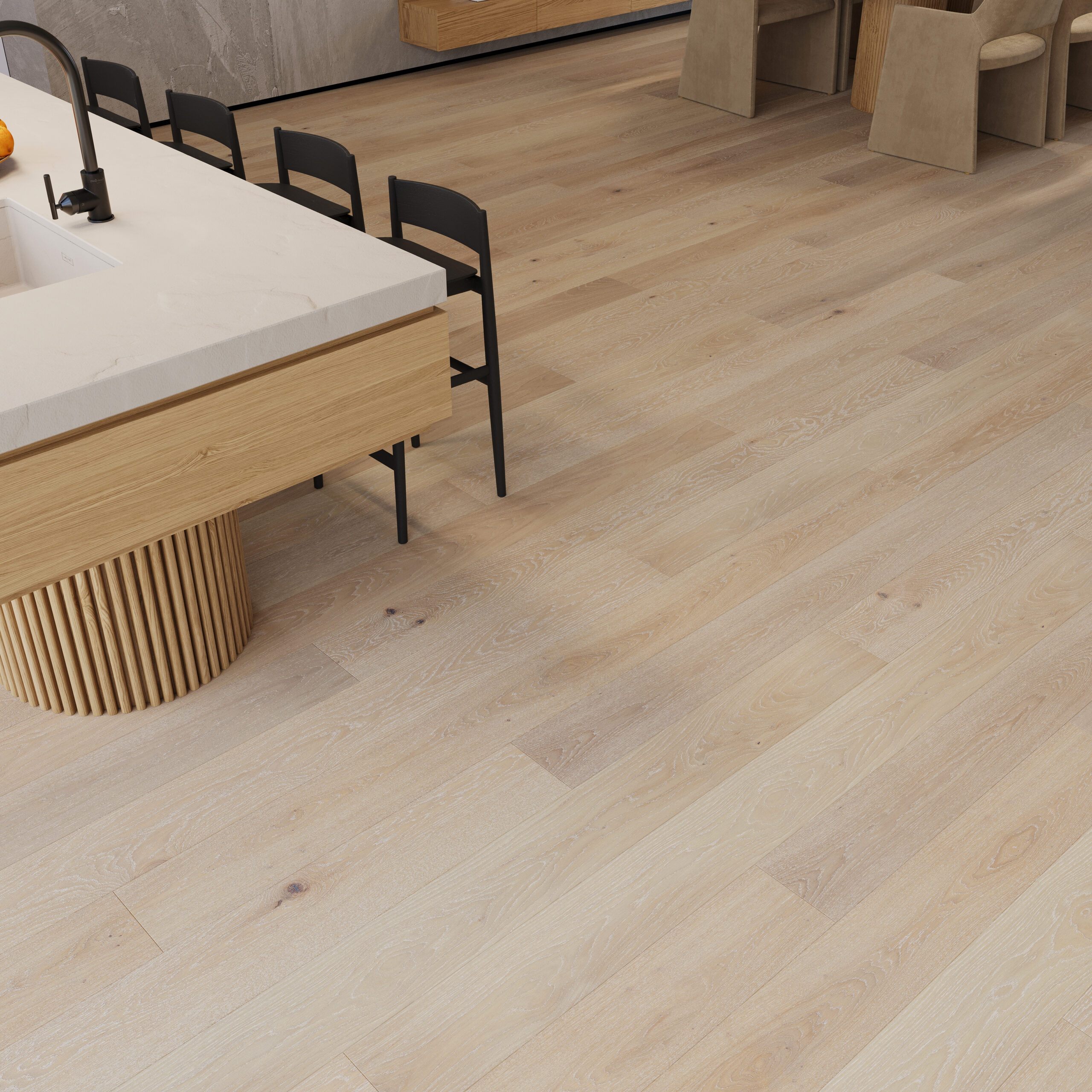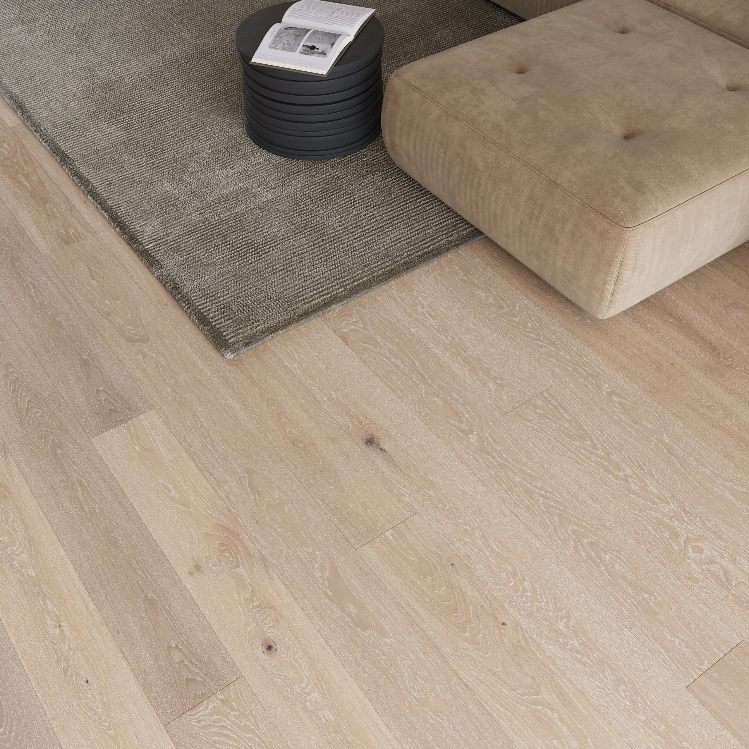 Parquet en chêne monofrise légèrement teinté d’une couleur chaude. La structure du bois naturel a été soulignée par le brossage. Fini avec du vernis mat.