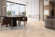3-lamelowa podłoga dębowa o delikatnym, kremowo-białym barwieniu. Deski uszlachetnione szczotkowaniem i zabezpieczone lakierem matowym.