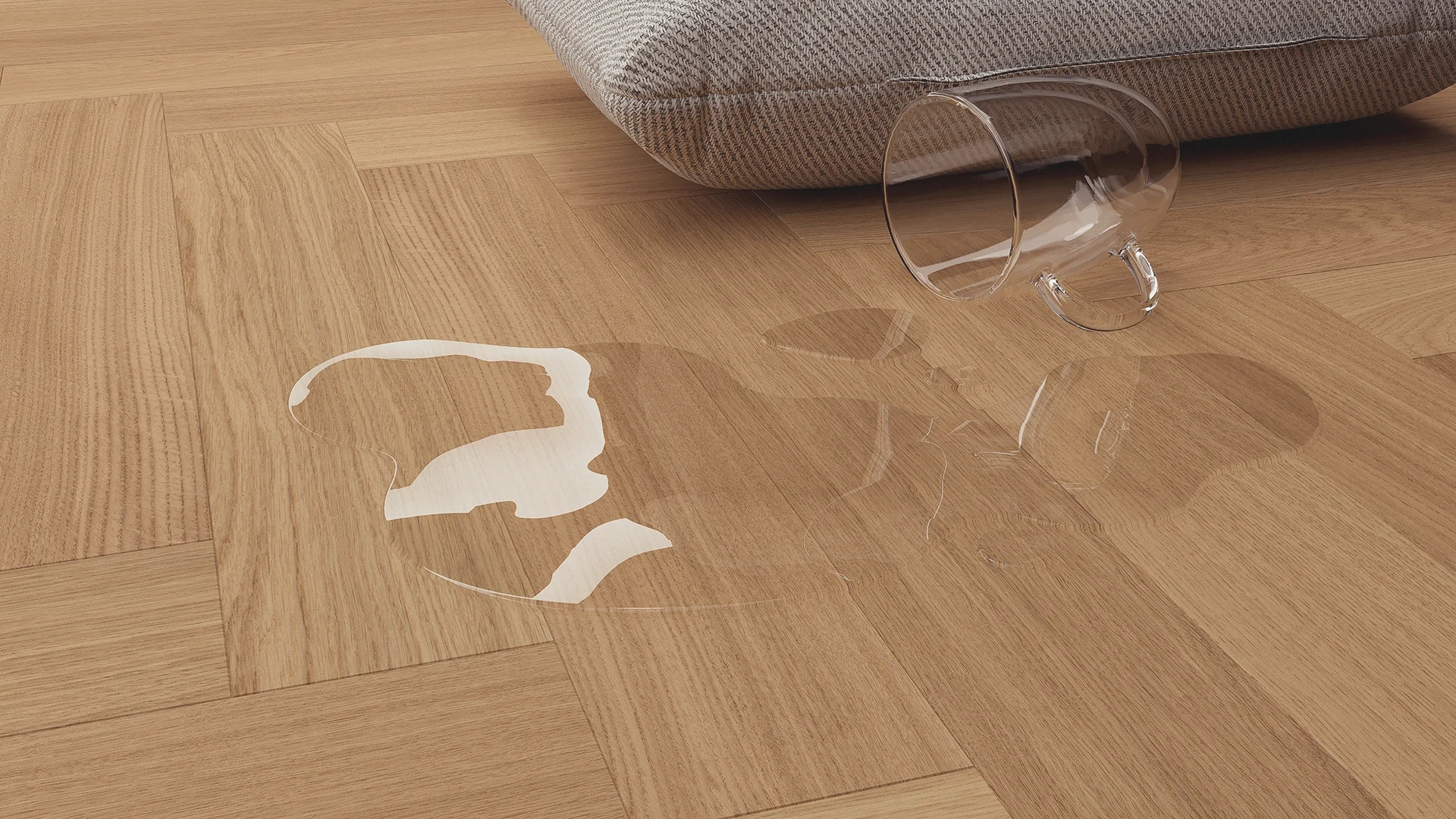 Parquet en chêne à chevrons classique dans une teinte crème délicate apporte chaleur et harmonie à l’intérieur. Le bois clair illumine l’espace, et la texture brossée met en valeur le dessin naturel des veines.