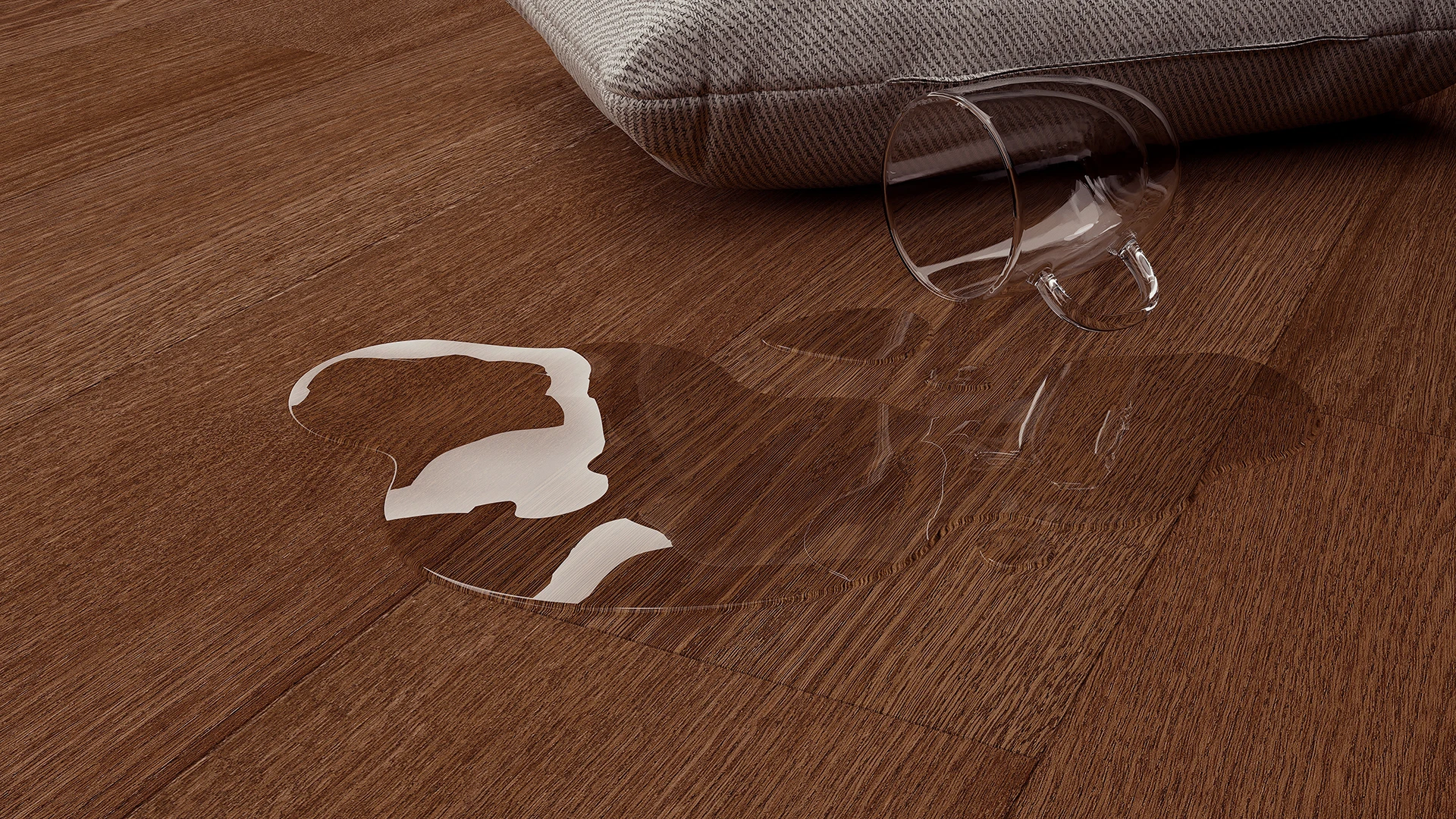 Parquet en chêne dans une teinte profonde de brun séduit par son élégance et son style affirmé. La couleur intense met en valeur le dessin naturel des veines, apportant noblesse et profondeur unique à l’intérieur.